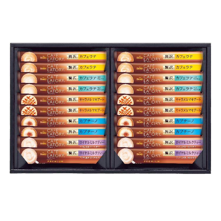 通常価格 ¥3,078(本体価格:¥2,850)「ブレンディ®カフェラトリー®」スティックプレミアム(贅沢カフェラテ・贅沢カプチーノ・贅沢キャラメルマキアート・贅沢カフェラテ甘さひかえめ各18g×各4、贅沢ロイヤルミルクティー19g×4)